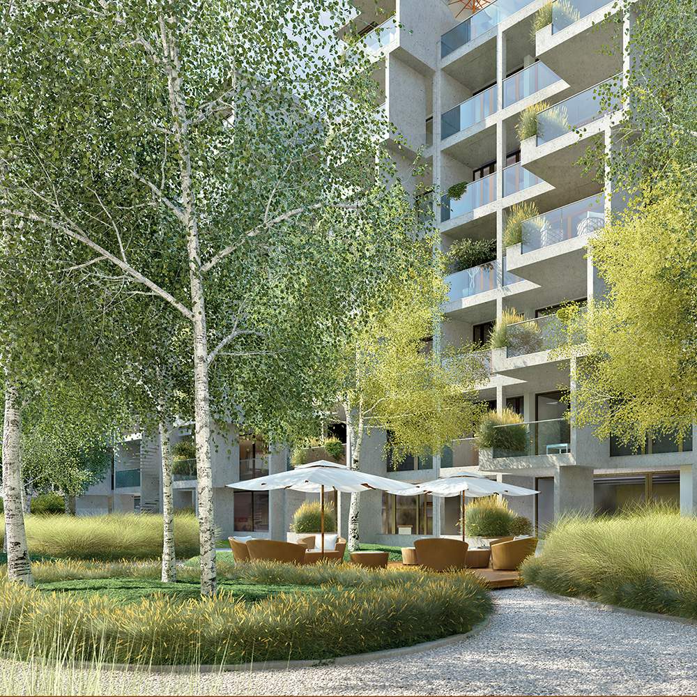An einem Sommertag ging Architekt Peter Külby in Mailand spazieren. In einer kleinen Seitenstraße der berühmten Via Montenapoleone entdeckte er, zwischen zwei Häuserfronten, einen grünen Innenhof. Mitten im Herzen der italienischen Metropole erschien ihm dieser wie eine idyllische Oase – ein Ort, an dem die Stadt Atem zu holen scheint. Ein Refugium mitten in der Großstadt. Der Innenhof inspirierte ihn zur Vision eines Wohnhauses, das sowohl einen botanischen Rückzugsort als auch alle Vorteile des Lebens in der Großstadt vereint. Diese Vision wird nun Realität: