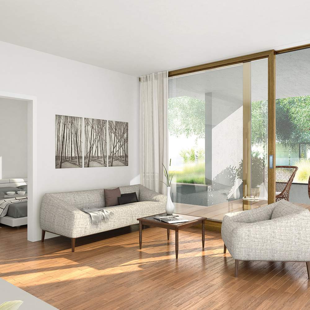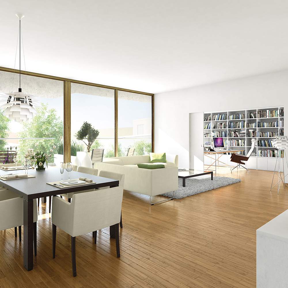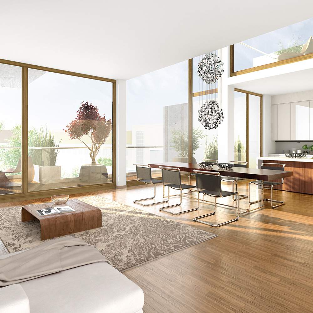 Der Grundgedanke von THE YARD ist, dass Wohnungen sich ihren Bewohnern anpassen sollen, nicht anders herum. Nur gegen hohe, helle und großzügig geschnittene Räume sollten Sie nichts haben – die gehören hier zum architektonischen Konzept. Bei vielen Wohnungen können Sie sogar in die Grundrisse eingreifen und sich Ihre ideale Wohnsituation schaffen. Von dem ersten bis zum fünften Obergeschoss können Sie sich auf 59 m² bis 181 m² in 2 bis 5 Zimmern genau so einrichten, wie es Ihnen entspricht. Raffinierte Schiebetür-Konzepte machen die Räume wandelbar und passen sich Ihrem Alltag immer wieder neu an.